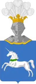 В голубом поле единорог белый, на шее которого зелёный венок. В навершии шлема пять страусовых перьев.