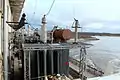 С гидрогенераторов электроэнергия напряжением 13,8 кВ подаётся на повышающие трансформаторы ТД-80000/220-У1 мощностью по 80 МВА, размещённые на здании ГЭС со стороны нижнего бьефа (каждый генератор выдает электроэнергию через свой трансформатор). Для ремонта трансформаторов вблизи здания ГЭС со стороны нижнего бьефа расположено здание трансформаторной мастерской[7]. С трансформаторов электроэнергия по воздушным переходам поступает на открытое Распределительное устройство (ОРУ) напряжением 220 кВ[7]. Также имеется ОРУ 110 кВ, для связи ОРУ 220 и 110 кВ установлены два автотрансформатора АТДТН-63000/220/110-У1, мощностью по 63 МВА каждый. Выдача электроэнергии с ОРУ в энергосистему осуществляется по линиям электропередачи, на напряжении 220 кВ (2 ЛЭП на Череповец и 2 на Углич и далее на Москву)[8]: