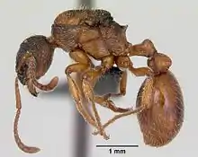 Мелкие рыжеватые муравьи длиной около 5 мм с длинными шипиками заднегруди (матки до 6 мм, самцы чёрные). Скапус усика рабочих плавно изогнут у основания (без зубца или лопасти). Стебелёк между грудкой и брюшком состоит из двух члеников: петиолюса и постпетиолюса (последний четко отделен от брюшка), жало развито, куколки голые (без кокона). Брюшко гладкое и блестящее[2].
