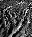 Рытвины Багдад: вид с юга на север (компьютерная модель); та самая форма "V", образованная двумя разломами