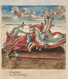 3. «Итальянский поединок» (нем. Welsch Gestech) на копьях с корончатыми наконечниками, в котором соперники скакали вдоль разделяющего барьера, главной целью было — преломить копья. Внутри двух первых групп имелось немало вариантов[42].