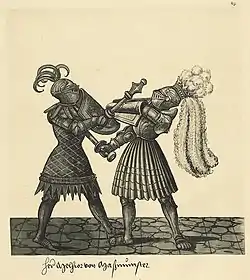 В XVI веке в германских землях распространился новый вид пешего турнира Fussturnier, представлявший собой сражение двух групп рыцарей, разделённых барьером. Зачинщики в этом виде состязаний назывались «хранителями», или «защитниками» (нем. maintenators), а их противники — «искателями приключений» (нем. aventuriers). Каждый из участников такого турнира должен был нанести сопернику три удара копьём и четыре удара мечом. Относительно высокий барьер препятствовал тому, чтобы в пылу схватки её участники не вошли в клинч[40].