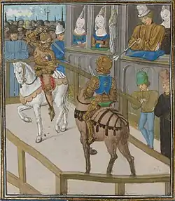 Также в качестве повода могли быть использованы въезд короля в город, посвящение в рыцари или просто желание развлечься во время затянувшейся осады[33]. Королевские турниры нередко созывались в честь коронации или свадьбы принцев или иных членов королевского дома[34].