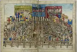 Арена, где предстоит турнир, ограждалась деревянной прочной оградой, и с одной её стороны строились из дерева трибуны для знатных зрителей. Отдельно строились ложи для наиболее знатных феодалов, организаторов турнира и тех прекрасных дам, которым выпала честь преподнести победителю турнира награду. В Манесском кодексе эти ложи прорисованы наиболее детально, также изображения их есть в рукописях «Хроник» Жана Фруассара.