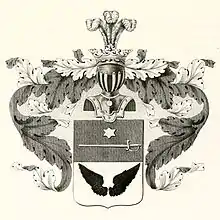 На щите, разделенном на две части, в верхней части, в красном поле, изображена шестиугольная золотая звезда, а под ней горизонтально положена серебряная шпага, острием в правую сторону. В нижней части, в серебряном поле, два орлиных крыла в виде полета вверх распростертые.