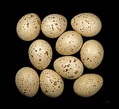 Яйца рябчика гладкие, блестящие, цвет их буровато-жёлтый, с редкими красно-бурыми крапинами, которых иногда может не быть. Основной цвет также варьирует от светло-жёлтого до почти коричневого. Окраска яиц несколько блёкнет за время насиживания[58]. В среднем кладка состоит из 3—14 яиц, чаще всего 7—9[58][60]. В исключительных случаях гнездо может содержать до 20 яиц, что, по всей видимости, является результатом откладки двумя самками[58]. Размеры яиц: 36—43 × 25—30 мм[60]. Насиживание начинается после откладки последнего яйца и производится только самкой. Самец в это время держится поблизости от гнезда. Насиживание длится 21 день[2], по другим данным, оно может продолжаться и 25—27 дней[61]. Самка сидит на гнезде настолько плотно, что иногда позволяет человеку дотронуться до себя. Будучи спугнутой, она старается отвести врага от гнезда, большей частью перебежкой по земле[9].