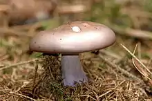 - Паутинник бело-фиолетовый (Cortinarius alboviolaceus) с остатком покрывала на ножке, которое часто окрашивается в ржаво-коричневый цвет