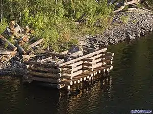Исследование дна и планировка производятся до образования льда. Если дно водоема имеет небольшой уклон, то рубку ряжа ведут таким образом, чтобы комли бревен были обращены в одну сторону и пришлись над более глубоким местом дна. При горизонтальном или выровненном дне водоема комли кладут попеременно в обе стороны. Наиболее удобным временем для устройства ряжевых фундаментов является зима в тех местностях, где в это время года вода замерзает и образуется достаточной толщины ледяной покров, могущий выдержать приходящийся на его долю во время этих работ груз. Когда вода замерзнет, на льду производят разбивку работ. Место, предназначенное для ряжа, очищают от льда, вырубая для этого достаточной ширины полосу льда. Через образовавшуюся таким путём майну (прорубь) перебрасывают ряд бревен, на которых производят сборку дна и первых четырёх или пяти венцов ряжа, после чего поддерживающие ряж бревна удаляют, продолжая рубку на воде. При рубке не над прорубью ряж спускают в последнюю, после того, как срублено несколько венцов выше дна ряжа. При наличии дна по мере сборки сруба производят загрузку ряжа камнем, постепенно погружая его в воду настолько, чтобы было удобно работать плотникам; при этом следят за равномерным погружением ряжа в воду, исправляя крен с помощью привязанных к нему канатов. Особенную осторожность необходимо проявлять, когда ряж близок ко дну водоема. Погрузку камня зимою надлежит производить возможно быстрее, не допуская образования льда внутри ряжа. По окончании рубки, когда сруб доведен до проектной высоты, производят окончательную загрузку сруба камнем, причём ряж принимает окончательную осадку. В летнее время сборку ряжа производят на берегу вблизи мест, достаточно глубоких для спуска на воду в тихую погоду; при этом сруб в пять примерно венцов спускают на воду и отводят к месту погружения, где начинают загружать камнем. В остальном работа летом ничем не отличается от таковой зимою. В США срубы заменяют клетками из брусьев, причём каждый последующий ряд перекрывает предыдущий в перпендикулярном направлении; брусья рядов скрепляются между собою, образуя жесткую систему. Загружаемый камень соразмеряется в данном случае с размерами зазоров между наружными брусьями клеток. От прибоя волн загруженные камнем клетки защищают каменной наброской в виде откоса, а против подмыва их располагают при слабом грунте на каменной постели, лежащей на уплотненном основании.[2]