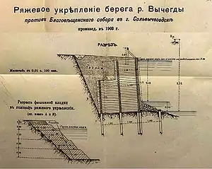 Ряжи — бревенчатые срубы с дном или без такового, заполняемые камнями и применяемые в качестве фундаментов под сооружения, возводимые в воде, например под набережные, опоры мостов, дамбы, молы и т. п. Ряжевые фундаменты устраивают в тех случаях, когда твердый грунт основания не допускает забивки свай или же, наоборот, при очень слабых грунтах основания (ил, торф). Так как в состав ряжевых фундаментов входит дерево, то высота ряжей должна быть такова, чтобы дерево постоянно находилось под водою, поэтому высота ряжевых фундаментов определяется положением самого низкого горизонта воды во время волны. Неприменимы ряжевые фундаменты в морях, в которых водится червь, разрушающий дерево. Расход камня при ряжах меньше, чем при фундаментах из каменной наброски. Ряжи со стороны воды имеют обыкновенно вертикальные стенки и потому допускают причал судов вплотную к пристаням, основанным на них. Ряжи дают дно в тех случаях, когда приходится их основывать на слабом грунте; при твердых и скалистых грунтах дно отсутствует. Ряжи рубят из бревен, соединяя бревна в местах их пересечения в обло и укладывая один венец на другой либо вплотную, либо с зазором. При укладке венцов с зазором ряжи требуют устройства достаточного числа поперечных связей и применимы лишь при наличии довольно крупного камня. В плане ряжи делают в виде прямоугольников, причём короткие стороны ряжей рубят из цельных бревен, длинные же стороны могли быть собраны из срощенных бревен.[2]