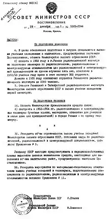 Рязанский радиотехнический институт (РРТИ) организован Постановлением Совета Министров СССР от 28 декабря 1951 года. Тогда же, постановлением Правительства СССР, были организованы Минский радиотехнический институт (МРТИ) и Таганрогский радиотехнический институт (ТРТИ).