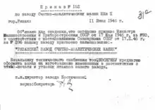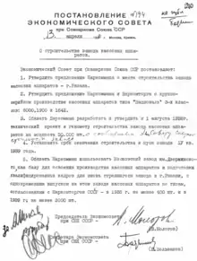 - Постановление экономсовета Совета народных Комиссаров СССР принято в апреле 1938 года, а Приказ о строительстве завода издан в июле 1939 года. 14 мая 1945 года Совет народных комиссаров СССР принял Постановление № 1082 о возобновлении строительства завода.