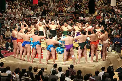 Сумоисты из лиги Дзюрё готовятся к схватке.