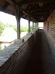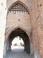 Для защиты входа в конце XIV века над воротами возвели прямоугольную башню, которая значительно выступала за лицевую часть стены. Перед воротами находился глубокий ров и подъёмный мост.