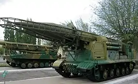 Стартовый агрегат 2П20 на колесном шасси МАЗ-537 (разрабатываемый одновременно с гусеничным 9П19) испытания не выдержал[1] и на вооружение принят не был. В 1967 году принята на вооружение пусковая установка 9П117 на четырёхосном самоходном шасси МАЗ-543П.