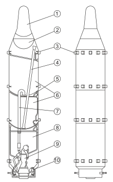 1 — моноблочная головная часть; 2 — приборный отсек; 3 — резинометаллические амортизаторы; 4 — система перелива окислителя из нижнего полубака в верхний; 5 — патрубки системы наддува баков; 6 — верхний и нижний полубаки окислителя; 7 — система забора окислителя; 8 — бак горючего; 9 — маршевый блок двигателя; 10 — рулевой блок