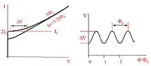 Справа: зависимость напряжения на контакте от магнитного потока через контур. Период колебаний равен одному кванту потока .