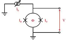 СКВИД на постоянном токе представляет собой два джозефсоновских перехода, включенных параллельно. Включение осуществляется массивными сверхпроводниками, которые вместе с джозефсоновскими переходами а и b образуют замкнутый контур (кольцо). Внутрь этого кольца введена катушка, создающая магнитный поток.