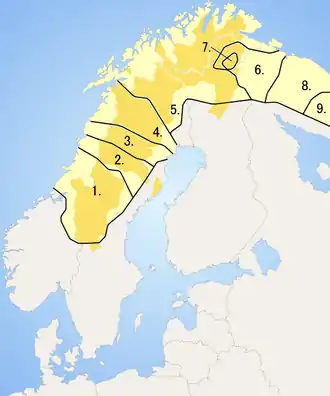 Особенностью саамов как народа является то, что территория традиционного проживания саамского населения в настоящее время входит в состав нескольких суверенных государств, имеющих различные социально-экономические и правовые системы, а также существенным образом отличающихся действующим законодательством в отношении коренных народов, национальных меньшинств, их языка и культуры[11]. Территория расселения саамов протянулась с востока на запад более чем на полторы тысячи километров — от восточной оконечности Кольского полуострова через север Финляндии и Норвегии до центральной части Скандинавского полуострова[12]. Саамы живут в Норвегии, России, Финляндии, Швеции, а также в Северной Америке (потомки переселенцев на Аляску) и, в небольшом количестве, на Украине[7]. Сами саамы называют свою страну Sápmi (Сапми).