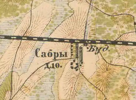 САБРЫ — деревня удельная при колодцах, число дворов — 18, число жителей: 69 м. п., 74 ж. п. (1862 год)[8]