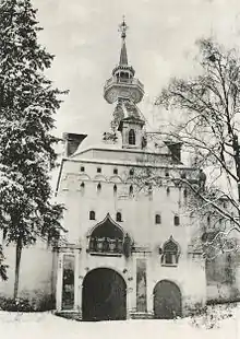 - Надвратный храм Живоначальной Троицы построен И. М. Шарутиным в 1650 году;