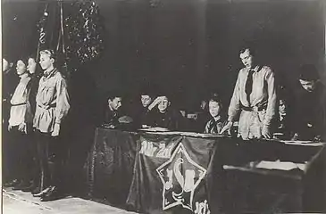 В. И. Ленин и А. В. Луначарский идут к месту закладки памятника «Освобождённый труд» на Пречистенской набережной. 1 мая 1920