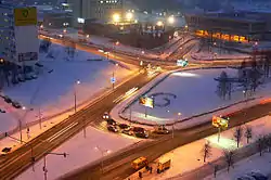 ![]() Перекрёсток Центрального проспекта и Савёлкинского проезда: слева-направо — южный торец «Флейты», нижняя часть бизнес-центра «Зеленый Град» с прилегающими магазинами и здание префектуры округа | |
