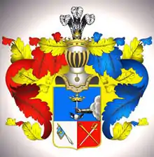 В щите, разделённом горизонтально на двое, в верхней половине в голубом поле с левой стороны видна выходящая из облака рука в серебряных латах с мечом (польский герб Малая Погоня), на остроконечии которого находится золотая дворянская корона, а под рукою серебряный шишак с двумя страусовыми перьями. В нижней половине, в правом серебряном поле, диагонально изображено знамя голубого цвета с золотым крестом, а в левом красном поле крестообразно положены золотая булава и шпага, остроконечием вниз. Щит увенчан дворянскими шлемом и короной со страусовыми перьями. Намёт на щите красного и голубого цвета, подложенный золотом.