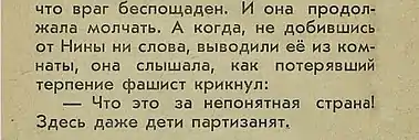 «Нина вспомнила то, что случилось два дня назад. Она возвращалась домой, когда вдруг увидела двоих арестованных. Совсем ещё мальчишки. Одному лет десять-двенадцать. Другому не больше четырнадцати. «Что же они босые-то, – вдруг забеспокоилась Нина, взглянув на ноги арестованных, холод-то какой!» Их израненные ноги, казалось, не чувствовали ни боли, не холода. Лица посинели и распухли от побоев. Они брели, глядя прямо перед собой, подгоняемые грубыми окриками конвоиров. Нина повернулась и пошла следом. Она и сама не знала, зачем это делает. <...> Ребят повесили, прикрепив каждому на грудь таблички с надписью: «Партизан». Они держались мужественно и смерть приняли молча. Нина бежала домой, не разбирая дороги, не видя встречных. <...> Мирно светила луна. У домов залегли глубокие тени. Тихо. Словно и нет войны. Словно не было и тех двух ребят. Нина закрыла глаза и тотчас ясно увидела разрушенную каланчу, а на ней покачивающееся на ветру тела казнённых. И даже почудилось, что она слышит поскрипывание перекладины. «Нет, этой тишине верить нельзя. И надо действовать сейчас же, сию минуту»…[1]