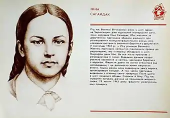 ![]() Нина Сагайдак. Пионер-герой. Советская подпольщица. Расстреляна немецкими полицаями за свою партизанскую деятельность. | |
