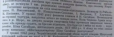 «…Два года и девятнадцать дней хозяйничали в Щорсе гитлеровцы. Они ограбили население, расстреляли тысячи людей. Фашистский комендант поселился в доме, где родился и вырос легендарный герой гражданской войны Николай Щорс. Это был музей — главная реликвия города. Все, что напоминало о Щорсе, комендант уничтожил. Одного он не мог понять, что нельзя ни сжечь, ни расстрелять память сердца!.. Город боролся, его подполье несло на своем знамени имя героя. И Щорс оживал в каждом борце. Выходили из строя электростанции, летели под откос паровозы, но неуловимы были партизаны. Нам рассказали, что, несмотря на зверские пытки, фашисты не сумели вырвать показания у юной партизанской связной Нины Сагайдак. Она погибла, не выдав врагу военной тайны. В тюрьме на двери камеры смертников было написано: «За правду судят, за брехню пидносять. Хто буде тут, выйде на волю — передавайте. Нина Сагайдак, шестнадцять рокив. 19.V.1943 г.» Другая надпись на стене гласила: «Шестнадцятилетнюю Нину Сагайдак расстреляли» [9].