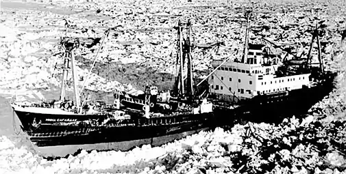 Теплоход „Нина Сагайдак“. Гибель во льдах8 октября «Нина Сагайдак» получила многочисленные пробоины левого борта, наружная обшивка была нарушена сразу в шести местах, в том числе — главная беда — в районе машинного отделения. Забортная вода стала поступать внутрь судна, началось разрушение механизмов, перестали функционировать водоотливные средства, что при наличии пробоин становится критичным. К утру 9 октября крен достиг 30 градусов. Ближе к полудню «Нина Сагайдак» встала на попа и в вертикальном положении, носом вверх, ушла в ледяные воды пролива Лонга. Когда стало ясно, что судно не спасти, экипаж сошел на лед и был эвакуирован вертолетом «Капитана Сорокина». И снова Сергей Решетов: «Когда мы узнали, что „Нина Сагайдак“ терпит бедствие, вывели на полную мощность все восемь наших дизелей. Но даже сдвинуться с места не смогли. На Холоденко было страшно смотреть: рядом гибнет судно, там твои друзья, земляки, однокашники, а ты, матерый ледовый капитан, ничего не можешь сделать. Было сильное ощущение бессилия, обиды и какой-то несправедливости…»[12]