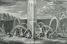 | «Вид на Бассейн Латоны»; гравюра Жана Лепотра, 1678 год | «Вид на Бассейн Аполлона»; гравюра Луи де Кастильона, 1683 год |