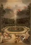 | «Зал Балов или Зал Совета»; автор Этьен Аллегрен, около 1688 г. | «Боскет Водного театра — вид на сцену»; автор Жан Котелль, около 1693 г. | «Боскет Трёх Фонтанов»; автор Жан Котелль, около 1693 г. | «Боскет „Триумфальная Арка“»; автор Жан Котелль, около 1693 г. | «Боскет купольных павильонов»; автор Жан Котелль, около 1693 г. | «Водный партер»; автор Жан Котелль, около 1693 г. |