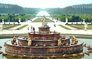 Выше Фонтана Латоны расположена терраса дворца, известная как Водный Партер.[14] Размещенный на парковой оси север-юг, Водный Партер является связующим звеном между дворцом и садами ниже. Отсюда открываются потрясающие виды на королевскую панораму, дающие понимание истинного масштаба садов Версаля. Атмосфера Водного Партера объединяет символизм и образы, использованные в оформлении Больших королевских покоев с образами, представленными в садах.[15] Именно отсюда можно в полной мере оценить симметрию, так любимую Ленотром, а вид на фасад дворца (670 метров вдоль сада) отсюда кажется наиболее величественным. В 1664 году Людовик XIV заказал серию статуй, которые должны были украсить водное пространство Водного Партера. В Большом заказе, как было названо поручение, было 24 статуи классических кватерностей и 4 дополнительные статуи, представляющих эпизоды похищений из классической истории (Berger I, 1985; Friedman, 1988,1993; Hedin, 1981—1982; Marie, 1968; Nolhac, 1901; Thompson, 2006; Verlet, 1961, 1985; Weber, 1981).