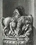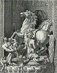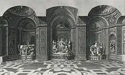 | «Внешний вид Грота Фетиды»; работа Жана Лепотра, 1672 год | «Солнечные кони за которыми ухаживают Тритоны, слуги Фетиды»; работа Жилль Герин, примерно 1670 год | «Служащие Аполлону нереиды» работа Франсуа Жирардон, примерно 1670 год | «Солнечные кони за которыми ухаживают Тритоны, слуги Фетиды»; работа Гаспар Марси и Бальтазар Марси, примерно 1670 год | «Внутреннее пространство Грота Фетиды»; работа Жана Лепотра, 1676 год |