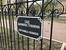 Сад между Гагаринской улицей и Соляным переулком долгое время был безымянным. 21 декабря 2017 года Президент России подписал Указ «Об увековечении памяти Д. А. Гранина и праздновании 100-летия со дня его рождения». Согласно данному Указу, правительству Санкт-Петербурга рекомендовано: присвоить имя Даниила Гранина скверу в Санкт-Петербурге и создать культурно-просветительский центр Гранина в одной из библиотек Санкт-Петербурга. Решением Топонимической комиссии от 25 апреля 2018 года и постановлением Правительства Санкт-Петербурга от 6 июня 2018 года было решено присвоить саду, расположенному между Соляным переулком, Гангутской и Гагаринской улицами, имя Даниила Гранина, а 5 мая 2019 года стараниями местных активистов на изгороди появилась табличка с именем писателя.