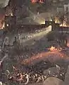 Если на центральной части запечатлено эротическое сновидение, то на правой створке — кошмарная действительность. Это самое жуткое видение Ада: дома здесь не просто горят, но взрываются, озаряя вспышками пламени тёмный фон и делая воду озера багряной, как кровь.