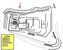 Три главные зубчатые стены в виде террас были построены на противоположном пологом склоне. При их строительстве использовался очень плотный и крепкий юкайский известняк серого цвета.[11] Самая длинная из стен имеет протяжённость около 400 м. Высота — 6 м. Частично они врезаны в глинистую почву холма, а частично имеют забутовку из глины и строительных остатков. Изъяны такой конструкции, вместе с ненадёжным грунтом под основанием, в настоящее время проявляются в подвижках и разрушениях строения. Стены имеют парапеты, за которыми могли укрываться воины, и несколько входов. По описанию, входы закрывались подъёмными камнями.
