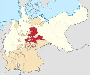 В 1815 году по итогам Венского конгресса по окончании освободительных войн территория королевства Пруссия (синий цвет на карте соответствует границам до 1815 года) была значительно увеличена (зелёным цветом отмечены приобретённые территории). В частности, Пруссия получила назад утраченные в 1807 году по Тильзитскому миру земли средней Эльбы (Альтмарк, Магдебург, Хальберштадт, Мансфельд, Кведлинбург), а также свои приобретения 1802 года, тоже потерянные в 1807 году (Айхсфельд, Эрфурт, Мюльхаузен, Нордхаузен).