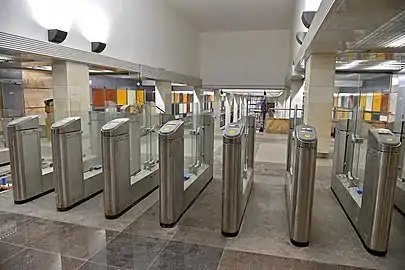 Один из вестибюлей станции (южный) работает только на выход пассажиров, а противоположный (северный) — только на вход. Аналогично организован вход и выход на станции «Беломорская».