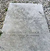 Надгробие на могиле Рафаэля Салема и его жены Адрианы Салем (Джентили ди Джузеппе) в городе Варанжвиль-сюр-Мер.