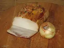 ![]() Солёное свиное сало, посыпанное молотым чёрным перцем | |