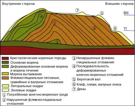 Основная форма рельефа — гряда, сложенная флювиогляциальными песками и галькой, обычно подвергшихся гляциотектонической деформации и перекрытыми мореной с внутренней стороны[2]. При описании гряды выделяют внешнюю (дистальную), центральную и внутреннюю (проксимальную) по отношению к положению границы ледникового покрова части.