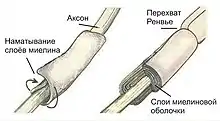 Мякотное нервное волокно покрыто миелином как электрический провод изоляцией. Но в отличие от последнего по длине нерва регулярно (через 1—2 мм) имеются микроскопические разрывы миелиновой оболочки — перехваты Ранвье.