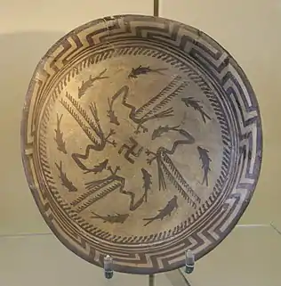 ![]() Самаррская чаша с росписями в виде движущихся рыб, птиц и свастики. Музей Передней Азии. Берлин | ||||