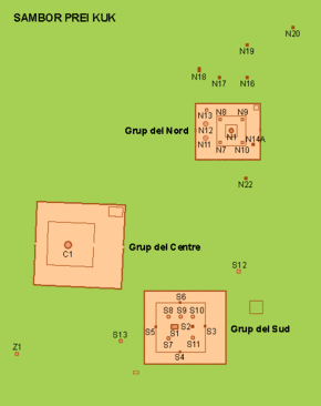 Самбор-Прей-Кук находится в долине реки Сен, которая идет параллельно Меконгу и впадает в озеро Тонлесап. В окружности 1 км расположены три основных комплекса религиозных сооружений (Анри Пармантье в 1927 году классифицировал их как Северный, Центральный и Южный), они огорожены и ориентированы примерно на восток, в окрестностях комплекса находятся руины более сотни менее значимых храмов и святилищ, частично покрытые джунглями.