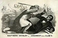 Во время гражданской войны в Канзасе Самнер боролся против билля Канзас-Небраска, не запрещавшего распространение рабства на свободные земли штата. 19-20 мая 1856 года он произнёс свою знаменитую речь «Преступление против Канзаса» с ядовитым обвинением рабовладельцев. В ответ представитель от штата Южная Каролина Престон Брукс напал на Самнера с тростью с золотым набалдашником, повалил его на пол сената и чуть не убил за то, что тот высмеивал его родственника, сенатора от Южной Каролины Эндрю Батлера как «сутенёра рабства»[5]. Это событие вызвало осуждение прогрессивной общественности — поэт Уильям Каллен Брайант и философ Ральф Уолдо Эмерсон осудил его как безусловно варварский акт; однако консервативные южане рукоплескали нападавшему и присылали ему новые трости, поощряя к дальнейшему насилию.