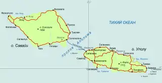 Однако уже в конце 1899 года острова Самоа были разделены на две части (линия раздела прошла по 171° з.д.): восточная группа, известная сейчас под названием «Американское Самоа», стала территорией США (острова Титуила — в 1900, Мануа — в 1905)[23]; западные острова получили название «Германское Самоа», а Британия отказалась от претензий в обмен на возврат Фиджи и некоторых других меланезийских территорий[24].