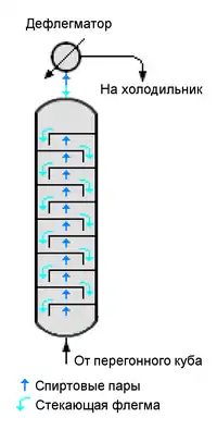 Спиртовые пары из перегонного куба поступают в нижнюю часть колонны и поднимаются вверх. На элементах насадки колонны (тарелки, сетки, шарики и т. п.) происходит частичная конденсация наиболее тяжелых фракций из пара — образуется флегма. Финальное освобождение спиртовых паров от флегмы происходит в дефлегматоре.