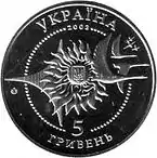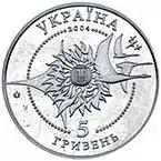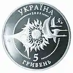 На аверсе: в круге из бусин — изображение малого государственного герба Украины в окружении аллегорической композиции из Солнца, стилизованного крыла, птиц и звёзд. Логотип Монетного двора НБУ, надписи «УКРАЇНА 2005 5 ГРИВЕНЬ». На реверсе: самолёт Ан-124 Руслан, логотип «АН», надписи «ЛІТАКИ УКРАЇНИ АН-124 `Руслан`». |